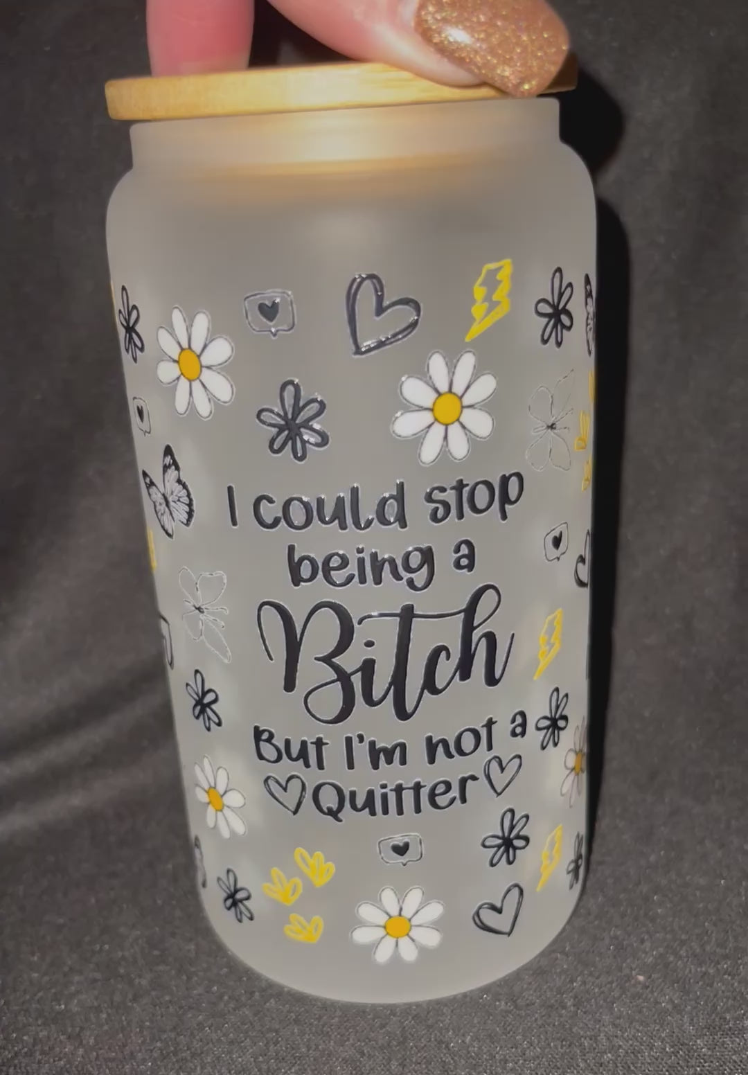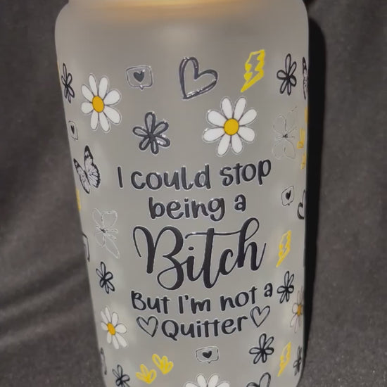 16oz Libby Glass with Permanent Vinyl Design. Comes with bamboo lid and straw.