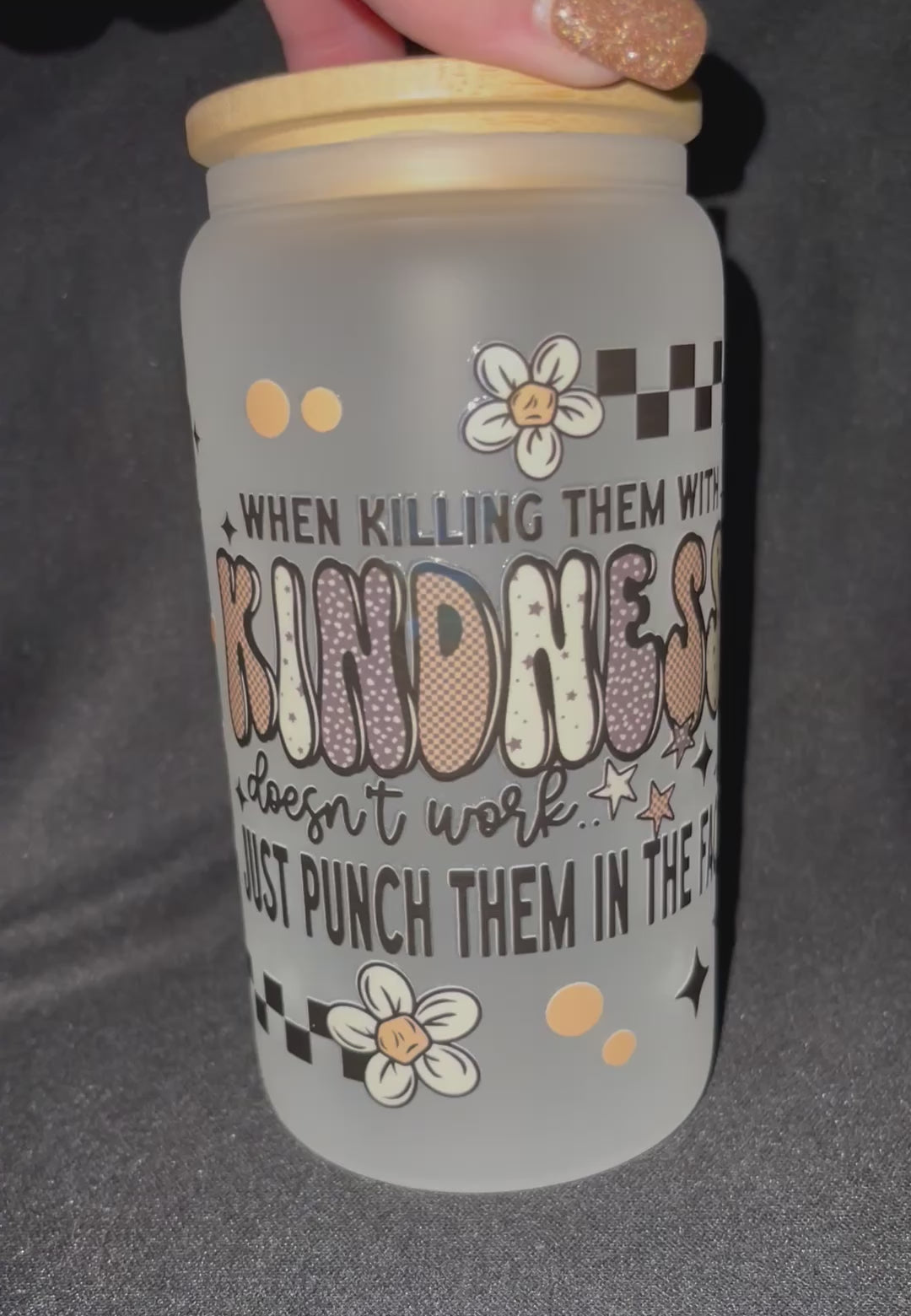 16oz Libby Glass with Permanent Vinyl Design. Comes with bamboo lid and straw.