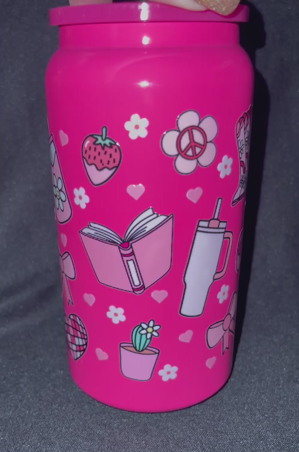 16 oz Stainless Steel Cup with Permanent Vinyl Design. Comes with lid and straw.